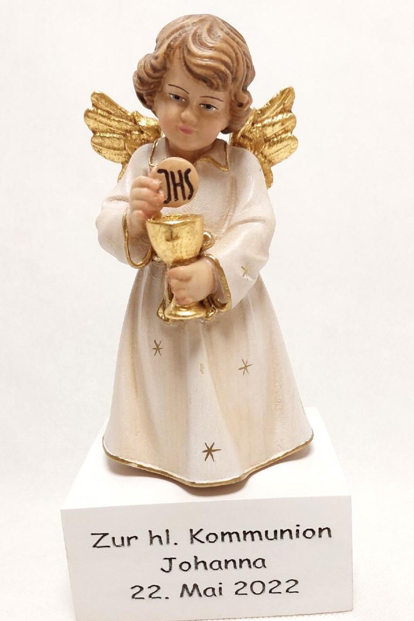 Schutzengel mit Kelch und Hostie Persönliche Geschenke sind der neueste Trend unter den Geschenkideen. Der Engel mit Sockel ist 20 cm groß und aus Bergahorn geschnitzt. Sie können auswählen ob der Engel fest mit dem Sockel verbunden werden soll. Gegen einen Aufpreis von 15 Euro können wir Ihnen auch auf der Unterseite eine Widmung eingravieren.
