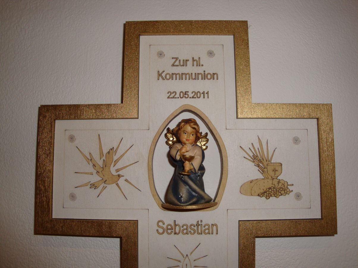 links zu sehen ist die Friedenstaube, rechts eine Abbildung mit Kelch, Brot und Getreide, und im unteren Teil des Kommunionkreuzes das Symbol der Kerze, in der Mitte steht ein geschnitzter Kommunionengel.