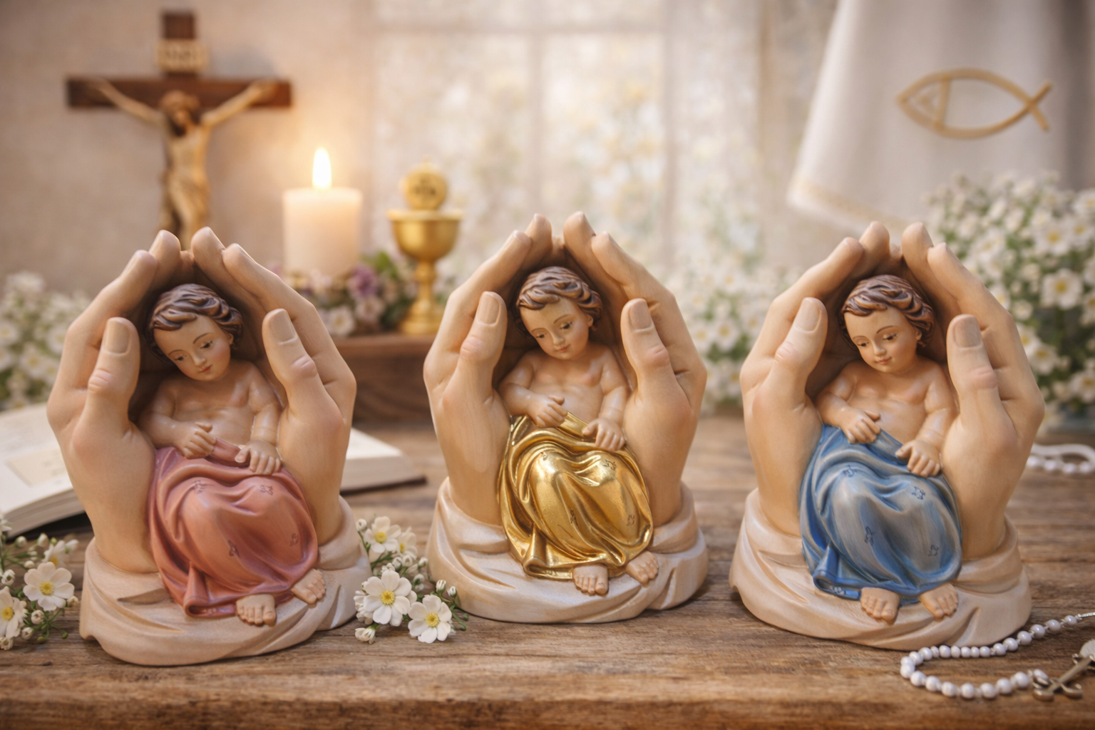 Die zarten Hände, die dieses Kindlein schützend umgeben, strahlen ein Gefühl der Geborgenheit aus, das tief im Herzen berührt. Das Meisterwerk an Schnitzkunst, in verschiedenen Farboberflächen gefertigt, vermittelt auf eindrucksvolle Weise das Thema "Geborgenheit". Ein Geschenk, das nicht nur zur Kommunion passt, sondern auch für andere besondere Anlässe geeignet ist. 🪵 Darstellung der schützenden Hände
