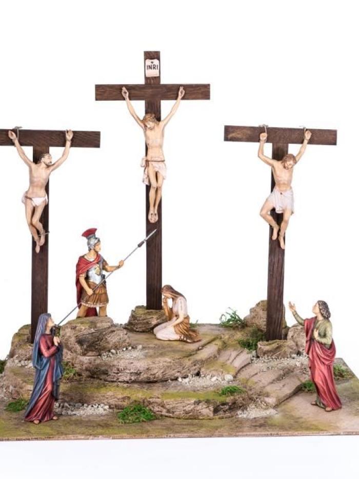 Diese Kreuzigungsgruppe mit 7 Figuren auf einer rechteckigen Landschaftsbodenplatte ist eine der prestigeträchtigsten Skulpturen von Holzfiguren2004 welche auf hochwertigste Holzschnitzereien spezialisiert ist. Die Szene der Kreuzigunsgruppe ist aus hochwertigen Ahornholz geschnitzt.