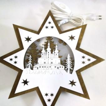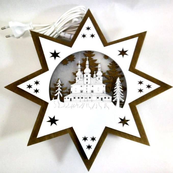 Wunderschön beleuchteter Holzstern mit der Dreifaltigkeitskirche Kappl Die erste Lage des Sterns ist in dunkelbraunen Sperrholz gefertigt und mit weißen Pergamentpapier hinterlegt. Der zweite Stern wird mit 3 mm Abstand aufgebracht, um einen schönen Beleuchtungsefekt zu erhalten. Die Kirche wird aufwändig graviert und mittels Laser ausgeschnitten. Der Stern ist beidseitig verwendbar und als Fensterstern bestens geeignet.