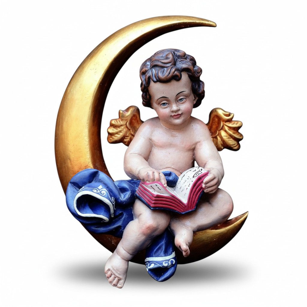 Mondengel sehr kunstvoll und detailreich aus Ahorn oder Lindenholz geschnitzt. Sie können die verschiedenen Oberflächen - Ausführungen der Figur sowie die Größen auswählen. Diese Holzfigur ist kurzfristig lieferbar. Heiligenfiguren und Holzschnitzereien werden auch heute noch nach traditionellen Techniken hergestellt . Alle Figuren werden maschienell vorgefräst und von Hand nachgearbeitet. Nur so können die Figuren bezahlbar produziert werden. Bemalte Holzfiguren werden mit hochwertigen Ölfarben von Hand veredelt und teilweise mit Blattgold belegt. Gerne fertigen wir für Sie einen Sockel mit Wunschgravur Beispiel-Gravursockel