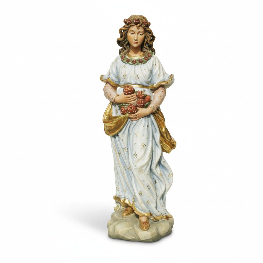 Rosenmädchen, sehr hochwertige detailierte Arbeit aus Ahorn oder Lindenholz geschnitzt. Sie können die verschiedenen Oberflächen - Ausführungen der Figur sowie die Größen auswählen. Die Holzfiguren werden mit hochwertigen Ölfarben von Hand bemalt und teilweise mit Blattgold veredelt.