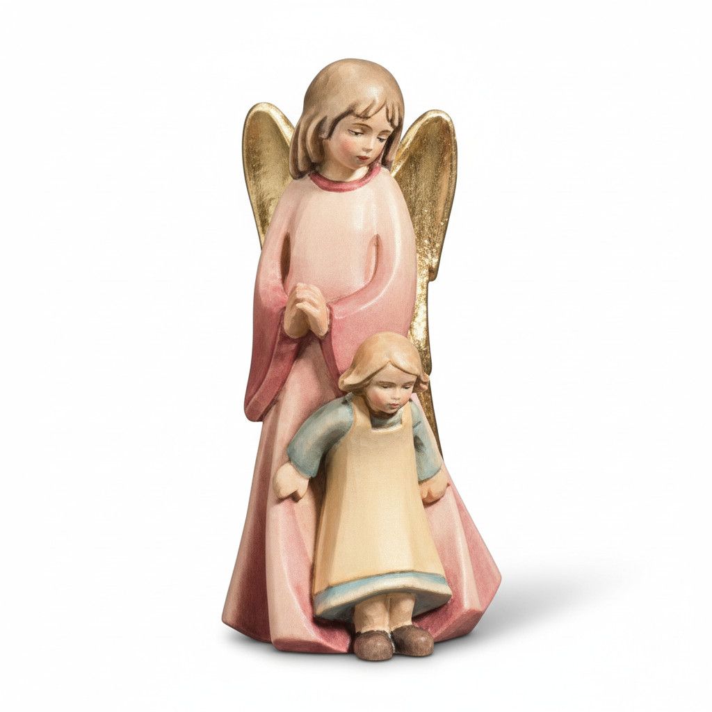 Schutzengel mit Mädchen modern zum stellen sehr kunstvoll und detailreich aus Ahorn oder Lindenholz geschnitzt. Sie können die verschiedenen Oberflächen - Ausführungen der Figur sowie die Größen auswählen. Diese Holzfigur ist kurzfristig lieferbar. Heiligenfiguren und Holzschnitzereien werden auch heute noch nach traditionellen Techniken hergestellt . Alle Figuren werden maschienell vorgefräst und von Hand nachgearbeitet. Nur so können die Figuren bezahlbar produziert werden. Bemalte Holzfiguren werden mit hochwertigen Ölfarben von Hand veredelt und teilweise mit Blattgold belegt. Gerne fertigen wir für Sie einen Sockel mit Wunschgravur Beispiel-Gravursockel