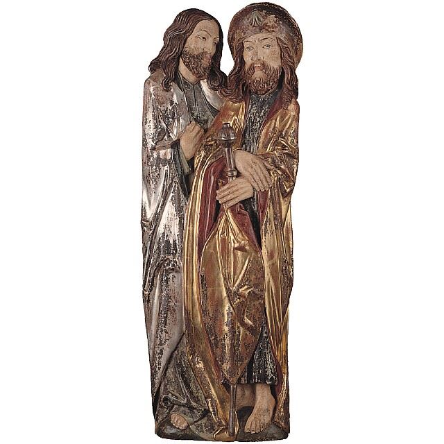 Dieses Apostelrelief mit den Aposteln Petrus und Johannes ist ein besonderes Beispiel traditioneller Holzschnitzerei. Die Darstellung zeigt zwei zentrale Figuren der christlichen Apostelgemeinschaft: