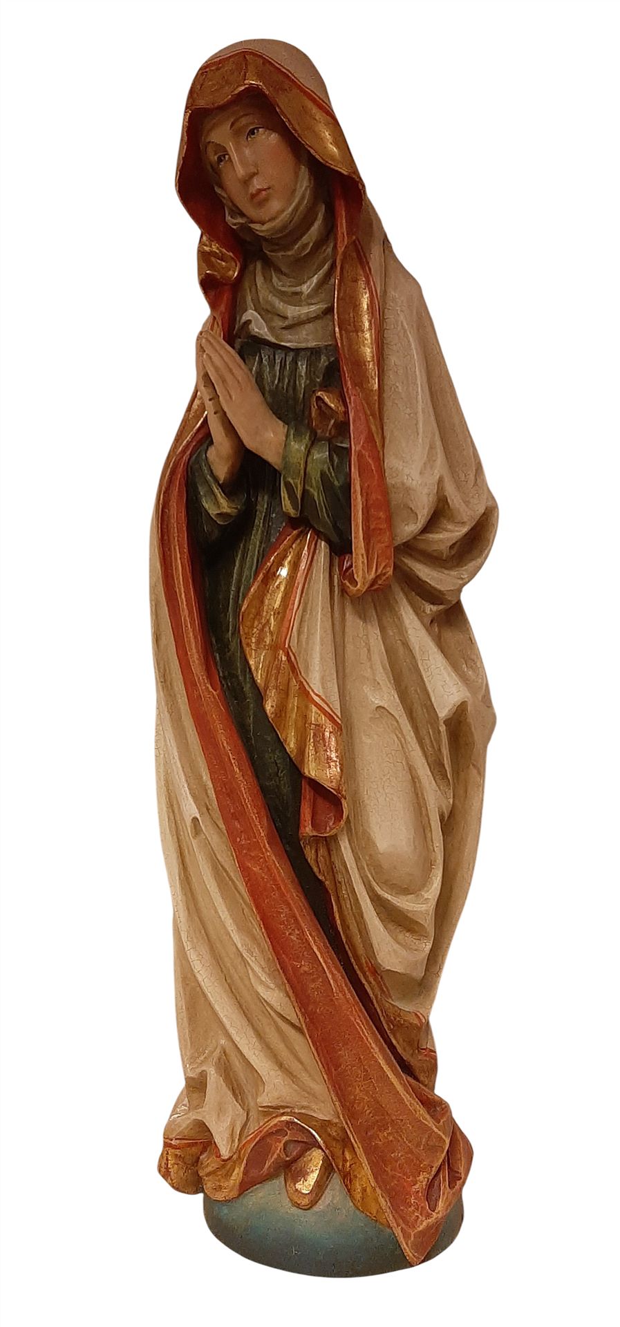 Diese wunderschöne Figur wird wahlweise aus hochwertigem Ahorn- oder Lindenholz gefertigt und anschließend in echter Blattgoldausführung veredelt. Das warme Leuchten des Goldes betont die sanfte Linienführung und verleiht der Madonna eine erhabene, zugleich friedvolle Ausstrahlung.