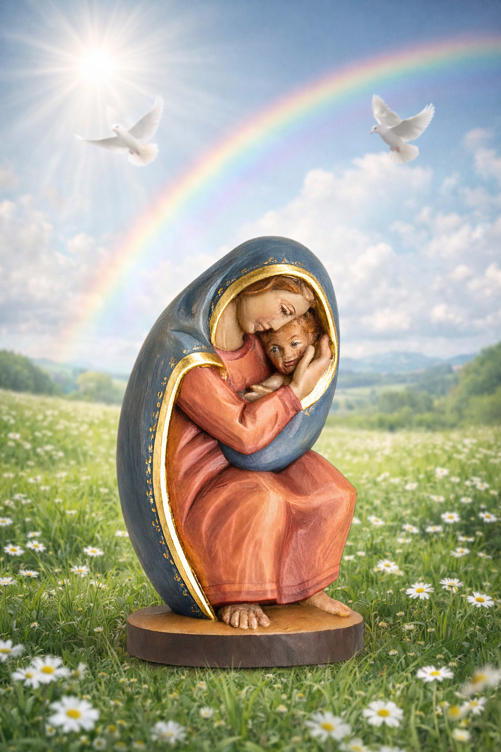 Die Madonna ist aus Ahornholz geschnitzt und wird in lebendigen Farben mit hochwertigen Ölfarben handbemalt. In ihrer Darstellung erinnert sie an eine klassische Schutzmantelmadonna: Maria neigt sich liebevoll zu ihrem Kind und umhüllt es schützend mit ihrem Mantel. Das Jesuskind strahlt Geborgenheit und Sicherheit aus, während es unter dem schützenden Stoff der Mutter ruht.
