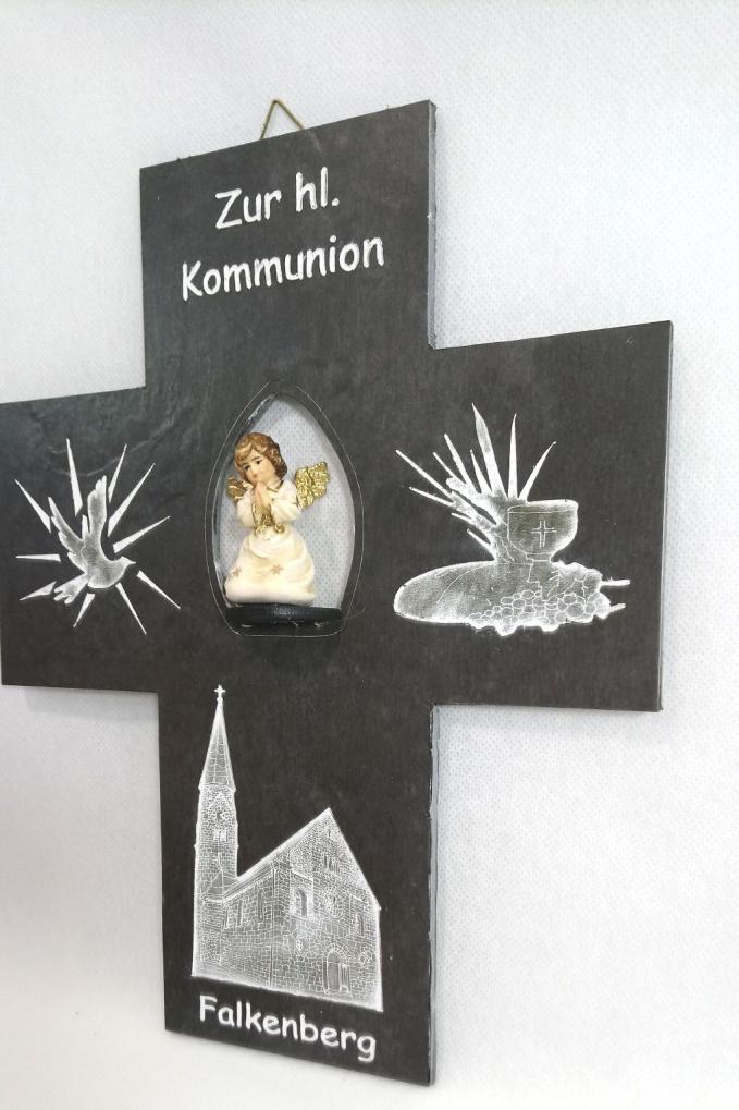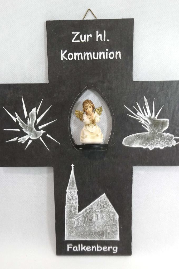 Modernes Kommunionkreuz aus hochwertigen Vinyl und geschnitzten Engelchen. Ein modernes Kommunionkreuz in Schieferoptik mit eingeprägten individuellen Texten und Motiven, Der geschnitze Engel betend ist mit weißen Gewand ist aus Ahornholz geschnitzt und mit Ölfarben handbemalt links zu sehen ist die Friedenstaube, rechts eine Abbildung mit Kelch, Brot und Getreide, und im unteren Teil wurde die Pfarrkirche St. Pankratius Falkenberg eingraviert, in der Mitte steht ein betenderr Kommunionengel. Wir benötigen folgende Angaben: -Name des Kommunionkindes -Datum der Erstkommunion -Ortsnamen
