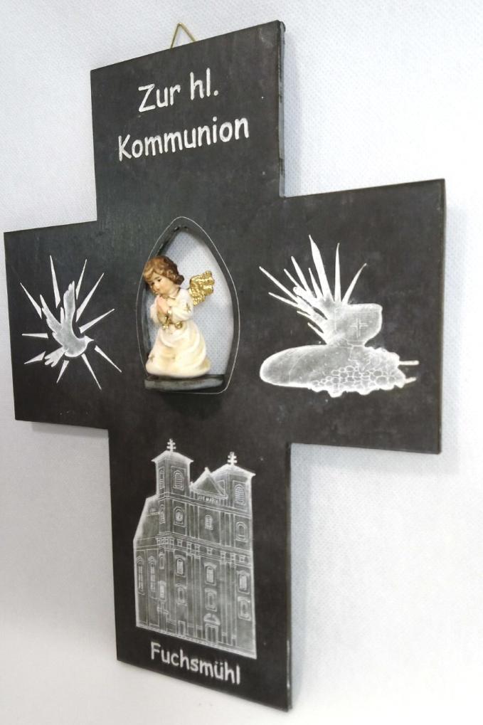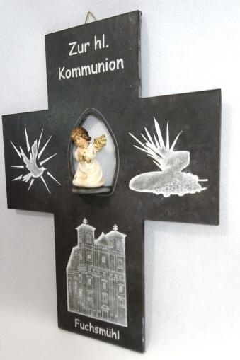 Modernes Kommunionkreuz aus hochwertigen Vinyl und geschnitzten Engelchen. Ein modernes Kommunionkreuz in Schieferoptik mit eingeprägten individuellen Texten und Motiven, Der geschnitze Engel betend ist mit weißen Gewand ist aus Ahornholz geschnitzt und mit Ölfarben handbemalt links zu sehen ist die Friedenstaube, rechts eine Abbildung mit Kelch, Brot und Getreide, und im unteren Teil wurde die Walfahrts Kirche Fuchsmühl eingraviert, in der Mitte steht ein betenderr Kommunionengel. Wir benötigen folgende Angaben: -Name des Kommunionkindes -Datum der Erstkommunion -Ortsnamen