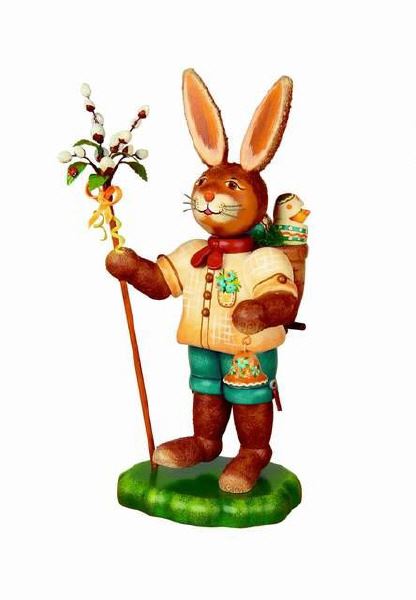 Der Hasenhans von Hubrig aus dem Erzgebirge hat sich auf den Weg gemacht, um rechtzeitig zu Ostern bei den Kindern zu sein und bunt bemalte Eier und kleine Schokohasen in die Nester zu legen. In seiner rechten Hand hält er einen Stab an dem er mit einem gelben Band Weidenkätzchen befestigt hat. Auf einem der Blätter sitzt ein kleiner Marienkäfer als blinder Passagier. In seiner linken Hand hat er eine schöne, mit Blumen bemalte, Glocke mitgebracht, mit der er die Osterzeit einläuten möchte. Auf seinem Rücken trägt er eine große Kiepe mit bunten Ostereiern. Wie es aussieht ist er schon einige Zeit unterwegs, denn aus einem der Eier schlüpft schon ein kleines Küken und betrachtet neugierig das ungewohnte Umfeld. Der Hasenhans hat seine kurze, grüne Hose und sein gelbes Kurzarmhemd angezogen, weil die Frühlingssonne schon ganz schön wärmt. Um seinen Hals hat er sich ein rotes Tuch gebunden und aus seiner Hemdtasche schauen ein paar Frühlingsblumen hervor, die er unterwegs gepflückt hat.