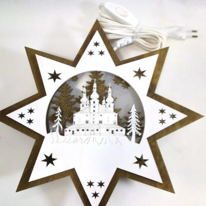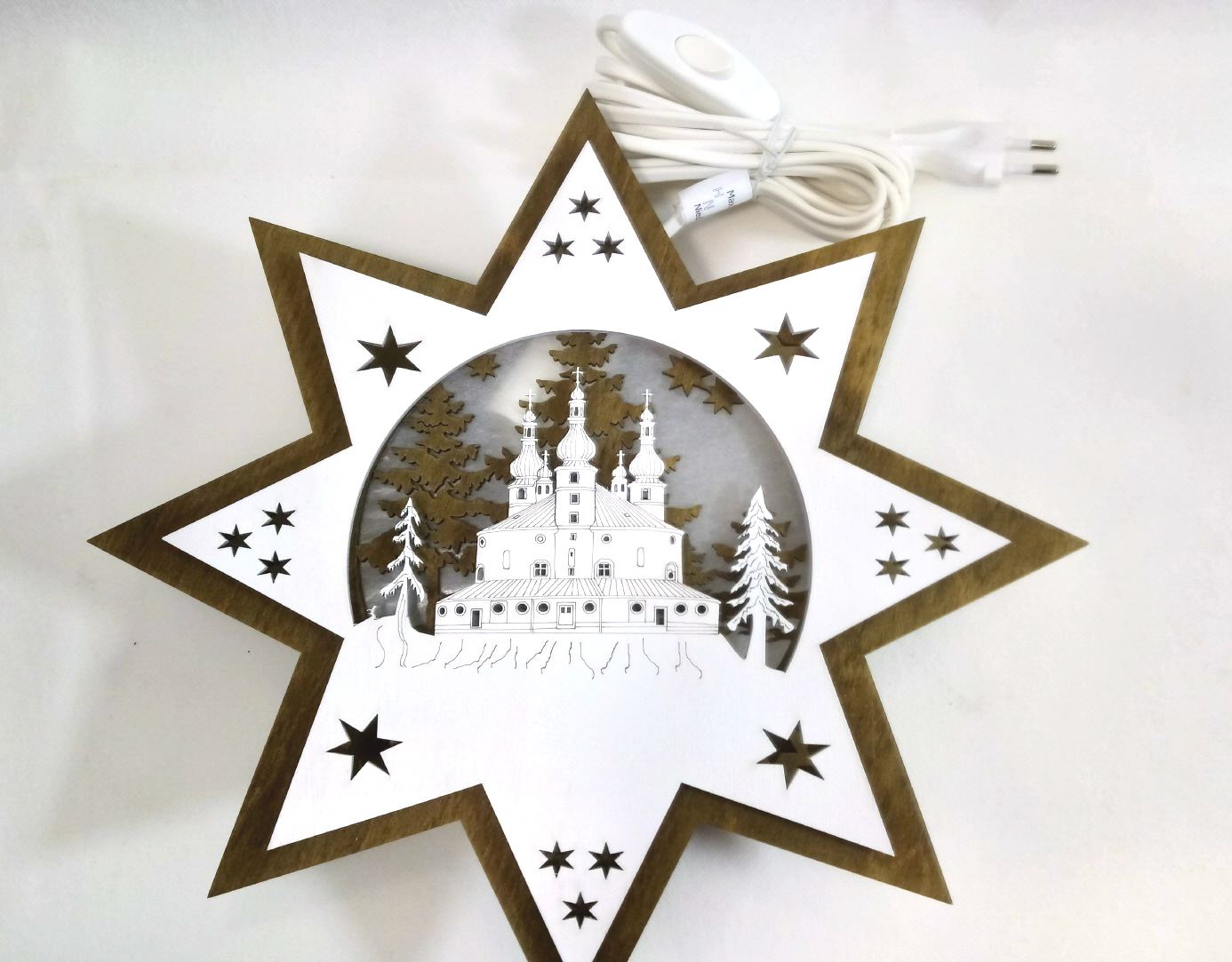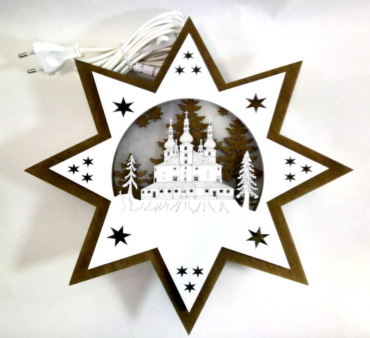 Wunderschön beleuchteter Holzstern mit der Dreifaltigkeitskirche Kappl Die erste Lage des Sterns ist in dunkelbraunen Sperrholz gefertigt und mit weißen Pergamentpapier hinterlegt. Der zweite Stern wird mit 3 mm Abstand aufgebracht, um einen schönen Beleuchtungsefekt zu erhalten. Die Kirche wird aufwändig graviert und mittels Laser ausgeschnitten. Der Stern ist beidseitig verwendbar und als Fensterstern bestens geeignet.