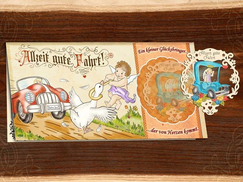 Glückwunsch-Karte "Gute Fahrt" m. Holzbehang