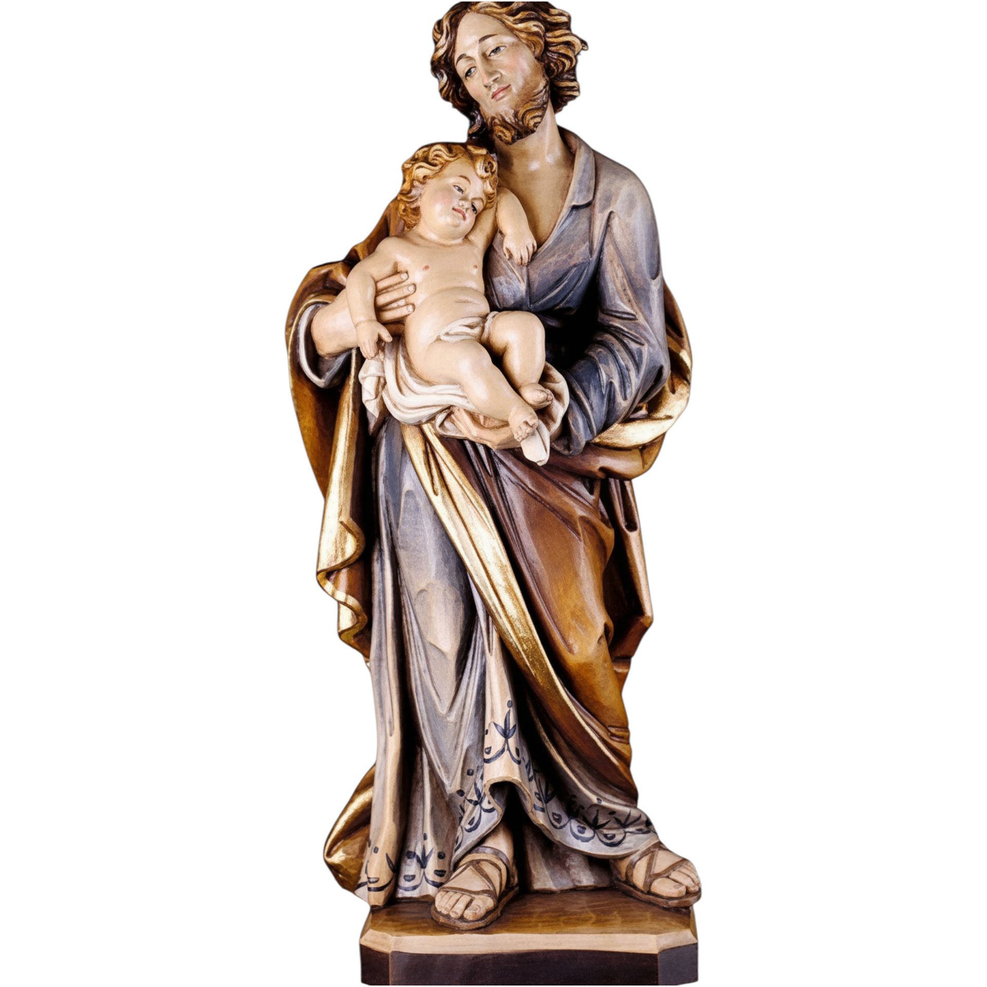 Die Holzfigur „Hl. Josef mit Jesuskind“ zeigt den heiligen Josef, Vater und Beschützer Jesu, in einer warmen, detailreich geschnitzten Darstellung des Jesuskindes in seinen Armen. Diese Figur wird in traditioneller Holzschnitzerei aus hochwertigem Ahornholz gefertigt und sorgfältig von Hand bemalt. Dadurch entsteht eine natürliche, ausdrucksstarke Ausstrahlung, die Glauben, Nähe und Vertrauen symbolisiert.