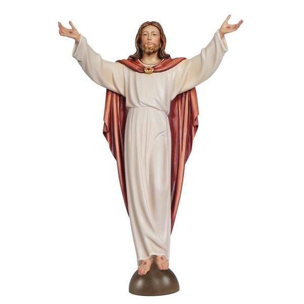 Die Figur ist fest auf einer Konsole montiert, die ihr gleichzeitig Stabilität und Präsenz verleiht. Das Gewand fällt in gleichmäßig geführten, weichen Falten, die Dynamik und Harmonie verbinden. Der Blick des Christus ist ruhig und offen, was seinem Ausdruck eine friedvolle und zugleich kraftvolle Dimension verleiht.