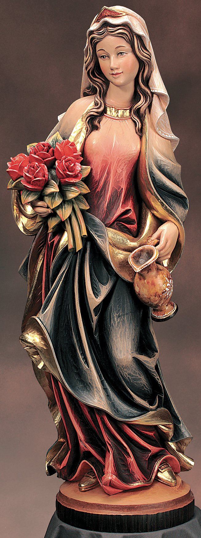 Entdecken Sie die zauberhafte Figur der Heiligen Elisabeth, kunstvoll und detailreich aus edlem Ahornholz geschnitzt! Wer könnte dem Charme solcher Heiligenfiguren und Holzschnitzereien widerstehen, die auch heute noch mit traditionellen Techniken von Hand gefertigt und mit hochwertigen Ölfarben liebevoll bemalt werden? Diese spezielle Heiligenfigur ist in der farbenfrohen Ausführung "Color" sofort verfügbar – ein wahres Meisterwerk für Ihr Zuhause!