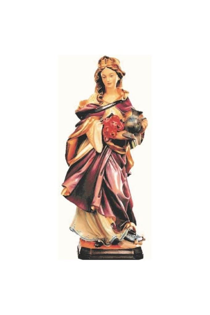 Figur der Eliabeth mit Palmzweig sehr kunstvoll und detailreich aus Ahornholz oder Lindenholz geschnitzt. Heiligenfiguren und Holzschnitzereien werden auch heute noch nach traditionellen Techniken, von Hand bearbeitet und mit hochwertigen Ölfarben von Hand bemalt. Diese Heiligenfigur ist in der Ausführung Color lagernd. Schutzpatronin der Bettler, Kranken, Notleidenden, unschuldig Verfolgten, Waisen, Witwen Holz ist vermutlich der älteste Werkstoff, den die Menschheit kennt und vielleicht zuletzt deswegen umgeben wir uns noch immer gerne mit Dingen, die aus Holz gefertigt wurden und fühlen eine innere Verbundenheit zu einem Material, dass warm und natürlich ist und bei dem jedes Werkstück durch die individuelle Materialbeschaffenheit zum Unikat wird.
