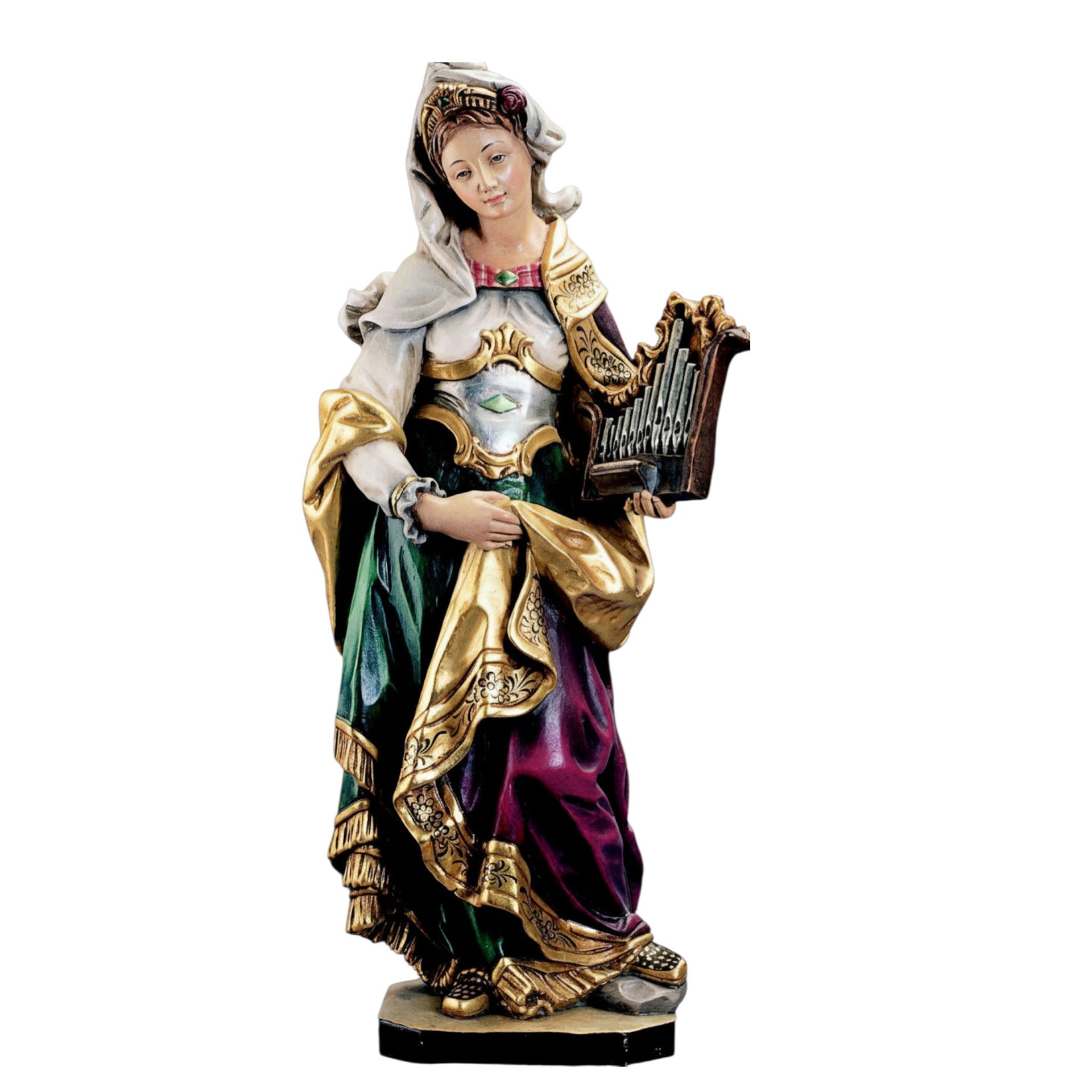Die Hl.Katharina wurde kunstvoll und detailreich aus Ahorn geschnitzt. Diese Holzfigur ist kurzfristig lieferbar.