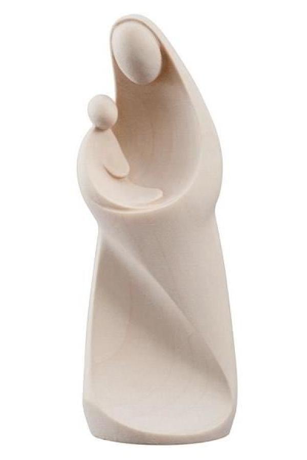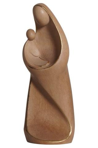 Die moderne geschnitzte La Madonna hält ihr Kind liebevoll in beiden Armen und blickt es freudestrahlend an. Die Figur wurde sehr dezent coloriert