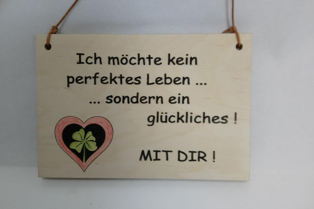 Holztafel :Ich möchte kein perfektes Leben sondern ein glückliches mit Dir als dekorativer Wandschmuck Maße der Holztafel ca. H 16 cm - Breite 200 cm, Dicke 15 mm Holzschild mit Vögel und Eulenpaar